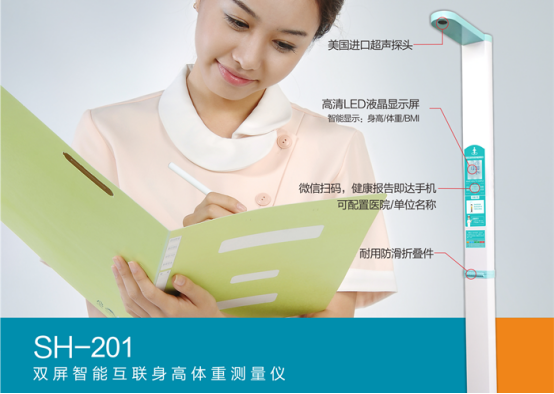 SH-201型雙屏智能身高體重測量儀是傳統(tǒng)數(shù)碼管身高體重測量儀的升級款,彌補(bǔ)了數(shù)碼管體重秤顯示效果單一,語音播報生硬的缺點。傳統(tǒng)的數(shù)碼管語音播報為機(jī)器播報,較為生硬;而SH-201型雙屏超聲波身高體重測量儀則采用智能語音播報,播報語音更人性化;雙屏采用高清的LED液晶顯示屏,可智能顯示身高、體重、BMI指數(shù), 另一個屏幕可配置醫(yī)院或者使用單位名稱,同時測量結(jié)果可以微信掃碼,兼具廣告宣傳和微信吸粉功能,展示效果更好。而在定價上,幾乎等同于數(shù)碼管秤的價格,真正的做到了增值不加價,更多讓利給客戶。