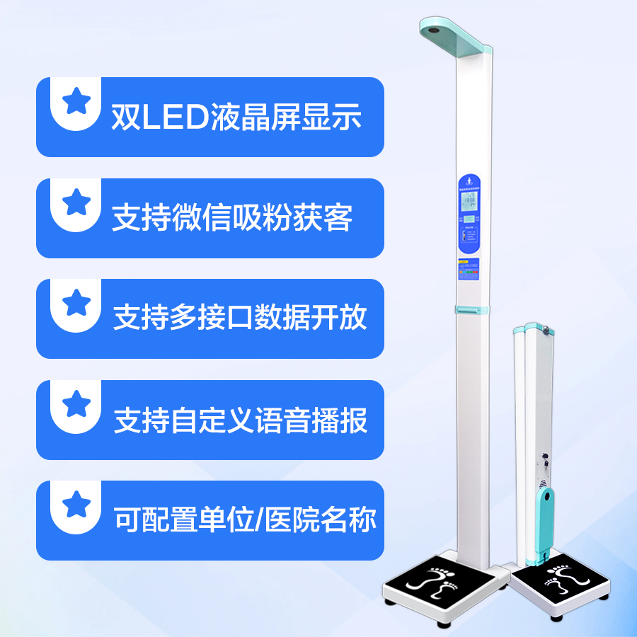 上禾SH-201智能雙屏身高體重測量儀,適合90%以上的春季體檢使用場景,雙屏顯示、可折疊、可設置您的專屬宣傳語、全自動測量、語音播報、數據傳輸等,您想要的功能,它都有!